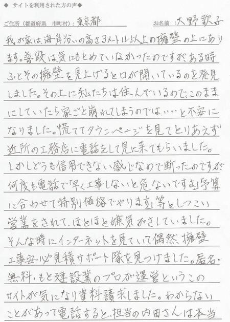 TOP | サイト利用のメリット | 無料提案お見積 | よくある質問 | お問い合わせ | パートナー会社募集 | 運営会社 擁壁の工事で大切なこと | 他社の一括見積りとの違い | 施工例 | 擁壁豆知識 | 良心的な業者の選び方 | 見積書チェックポイント このサイトを利用した方の声 | サイトを立ち上げた理由 | 擁壁工事安心見積サポート=5つのミッション= トピックス(地盤に関連する最近のNews) | 住まいの「足もと」大丈夫? | 地盤に関して知っておきたい事 知っておきたい擁壁知識 | 公示されている申請書類一覧(助成金制度・融資斡旋制度等) | 知らないと損地盤の保険について お問合せフォーム | プライバシーポリシー | パートナー会社募集 | サイトマップ Copyright (C) 2011擁壁工事安心見積サポートnet. All Rights Reserved. |